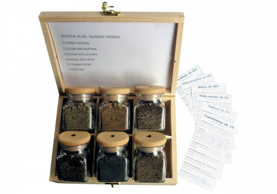 W drewnianej skrzyneczce znajduje się 6 ponumerowanych słoiczków o pojemności 120 ml każdy, zawierających próbki najpopularniejszych gleb występujących w Polsce do której należą niżej wymienione: