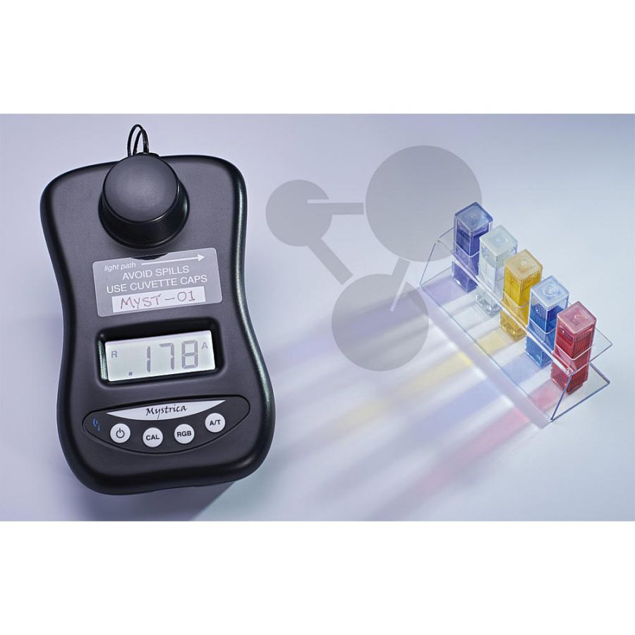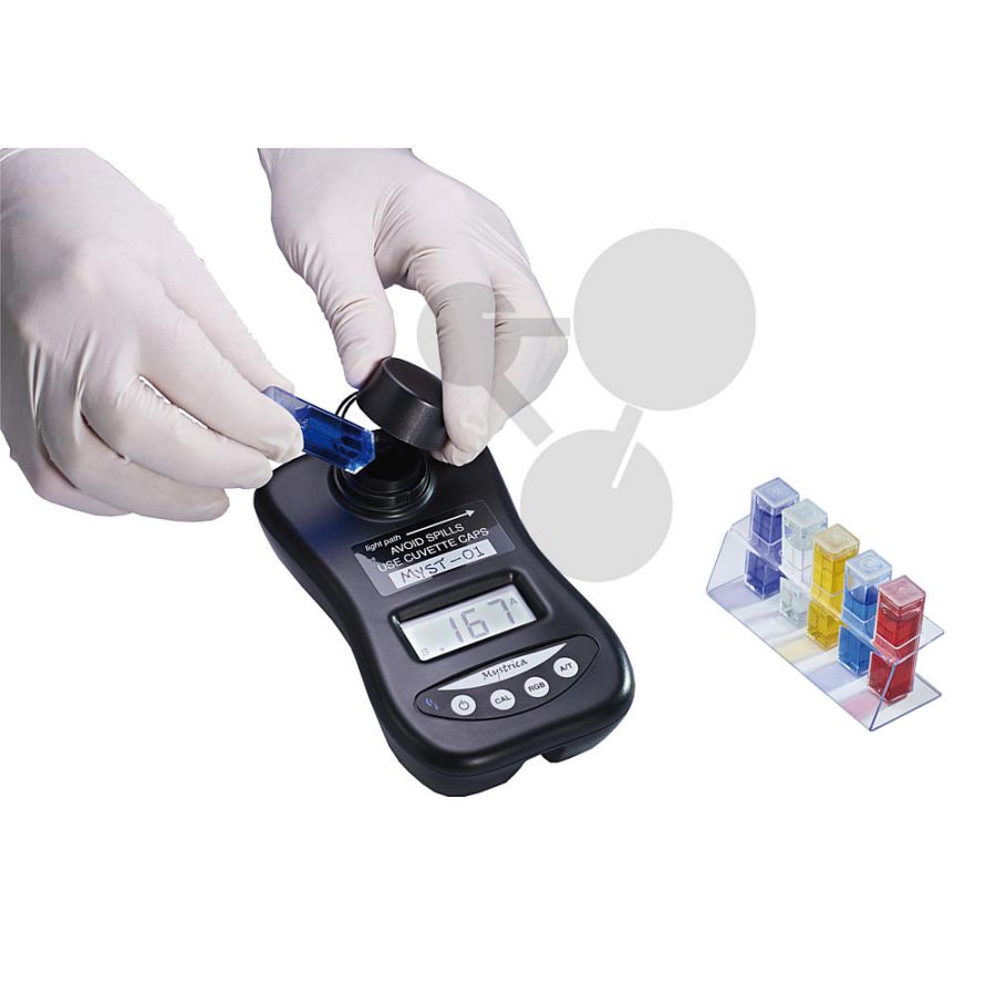 Kolorymetr, uchwyt na kuwety, 10 kuwet, 10 pokrywek do kuwet, 2 probówki 12 mm, 1 przewód USB, instrukcja obsługi