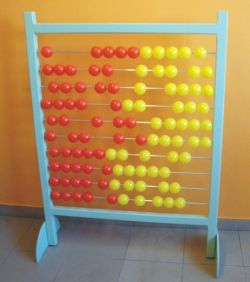 Wykonane jako pojedyncze skrzydło z ramy drewnianej w pastelowych kolorach. Na prętach umieszczone są żółto-czerwone kulki plastikowe puste w środku o średnicy 60 mm. Zaleta dużych kulek to bardzo dobra widoczność z daleka, oraz atrakcyjny wygląd liczydła.