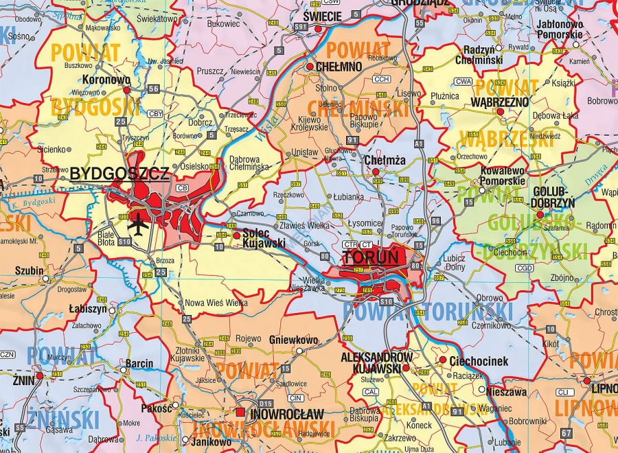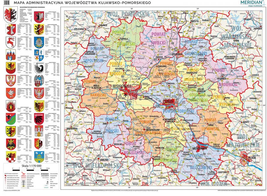 Ścienna mapa aktualizowana w roku 2020 przedstawiająca administracyjny podział województwa kujawsko - pomorskiego wraz z uwzględnieniem sieci dróg i autostrad oraz kolei. Ilustrowany herbami panel boczny zawiera informacje o województwie oraz o poszczególnych powiatach, takie jak: powierzchnia, ludność i struktura administracyjna.