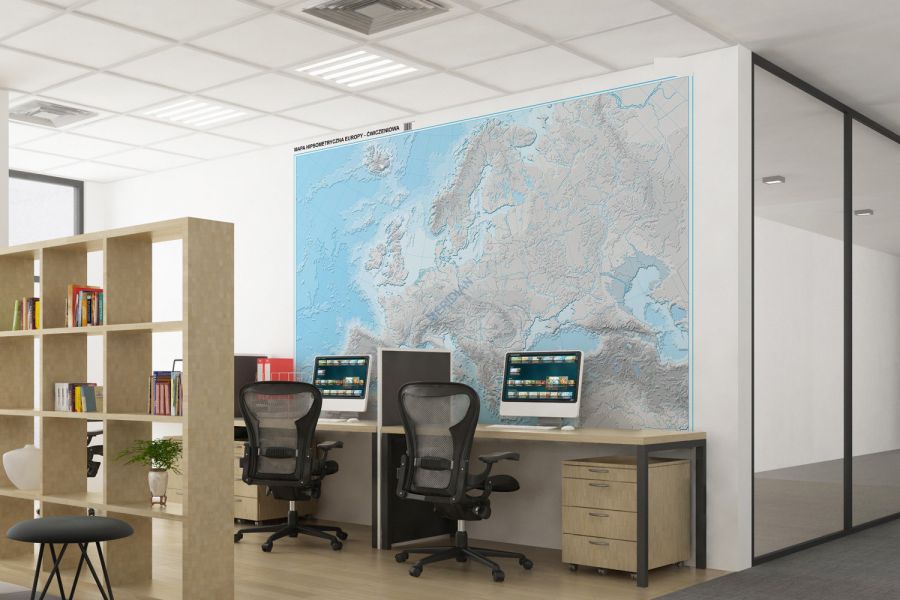 Ścienna, ćwiczeniowa mapa szkolna do geografii przedstawiająca ukształtowanie powierzchni Europy. W treści mapy oprócz przebiegów poziomic znajduje się warstwa hydrografii oraz granic państwowych.
