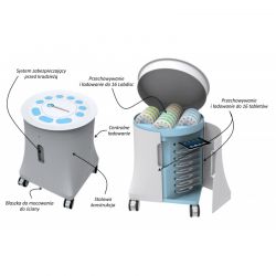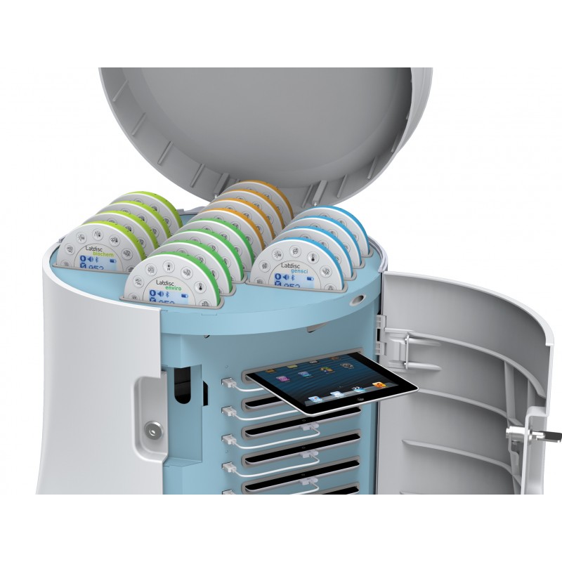 16 dysków pomiarowych (Biochem, Uniwersalny, Fizyka) oraz 16 tabletów (10″). Dzięki temu rozwiązaniu po zakończeniu zajęć można naładować wszystkie dyski oraz tablety bez niepotrzebnej plątaniny zasilaczy i kabli. Szafka wyposażona jest również w kółka dzięki czemu wygodnie można przejechać z całą zawartością z jednej sali lekcyjnej do drugiej. Część przeznaczona na tablety zamykana jest na klucz. Producent przewidział również miejsce do przechowywania zewnętrznych sond i czujników.