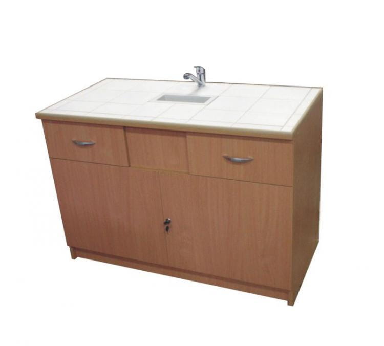 Stolik laboratoryjny jednokomorowy wykonany na konstrukcji płyty laminowanej 18mm, wyposażony w blat pokryty litą ceramiką techniczną, zlew, zawór wodny, 2 szuflady, drzwiczki. Stolik dostępny w kolorach biały, popiel, buk. Dodatkowe kolory na specjalne zamówienie.