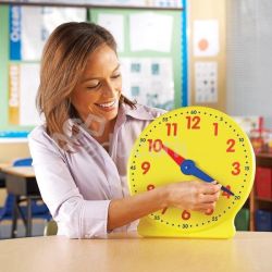 Demonstracyjna tarcza zegarowa wyposażona jest w system kół zębatych, dzięki czemu automatycznie zachowuje relację minut i godzin w trakcie demonstracji. Dwa kolory wskazówek zgodne są z podziałką tarczy na godziny (kolor czerwony) i minuty (kolor granatowy), co znacznie ułatwia naukę odczytu czasu. Podobny kod kolorystyczny mają także tarcze zegarowe dla uczniów.