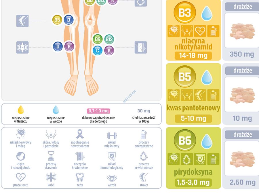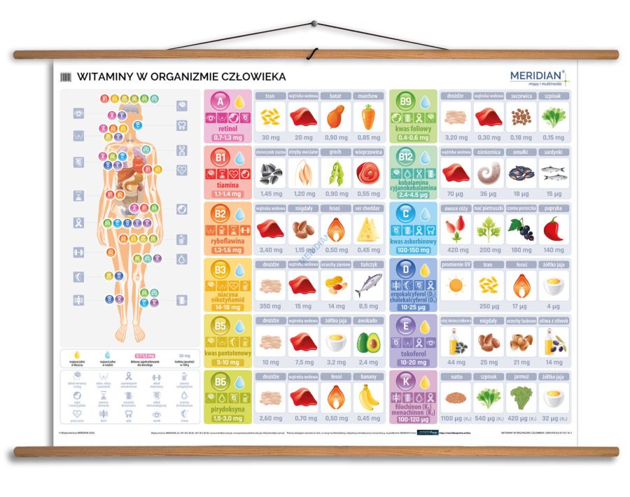 Ścienna plansza szkolna do biologii i edukacji zdrowotnej przedstawiająca witaminy, ich rolę w organizmie człowieka oraz główne źródła w pożywieniu.